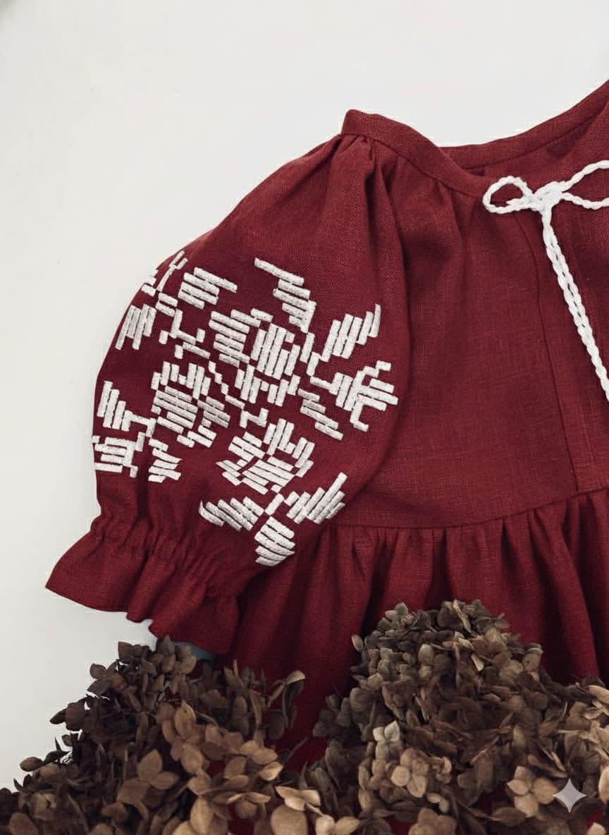 Crafted from soft, breathable cotton in a deep Maroon shade, this dress features beautiful white embroidery on the puff sleeves, adding a touch of classic elegance. Whether it’s a birthday, family gathering, or a casual outing, Maroon Grace keeps her stylish and comfortable all day long.